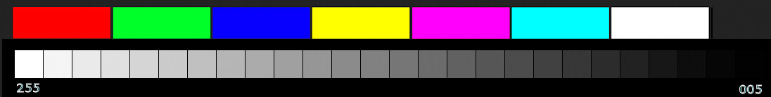 Contrast and Brightness Scroll down a bit and you will see a test pattern similar to many you can find on the Internet. The color patches do not mean a whole lot but the gray scale is useful for eyeball calibration or making adjustments preliminary to instrument calibration. This test pattern is my own creation, incorporating a few things make it superior to most others. For one thing, patches are separated by narrow black borders which minimizes distracting Mach bands. The gray patches are 8 bits per channel and run from a value of [005,005,005] through [255,255,255], the step-per-patch being 10. Ideally, with brightness and contrast correctly set, you should see some difference between the two brightest patches and between the two darkest ones. The dark patch test is the more challenging of the two, especially at the over-all brightness suitable for photo work. A real weak spot in both calibration methods and not well dealt with anywhere is initial setup of the monitor for brightness and contrast. Somewhat counter-intuitively on LCD monitors, it is the contrast control you need to adjust for best separation of the white patches. Brightness actually determines brightness of the LCD back-panel and it is primarily this which determines separation of the black patches. On top of it all, settings of the R/G/B level or gain controls affects image brightness apart from contribution of the back-panel. This is a rather embarrassing part of calibration. It sounds and is wishy-washy. My method, which works, is this: