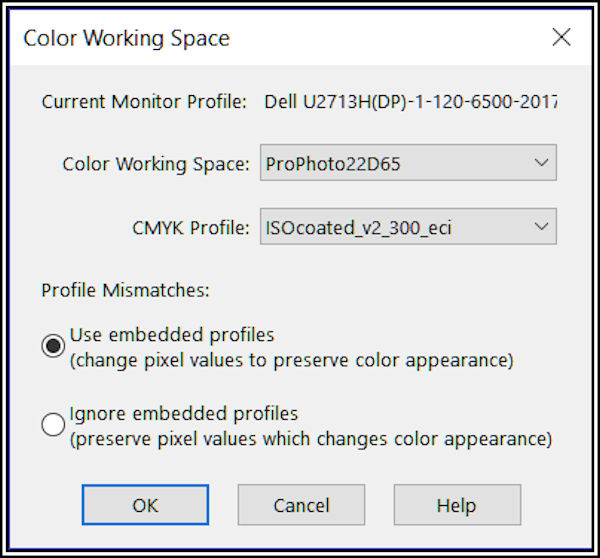 How to Execute Some Color Management Processes Much of what follows may never be necessary these days and is mainly applicable to legacy images and processes if you take my advice concerning the Prophoto color space and associated profiles. If your image as produced by your RAW/NEF converter lives in the Prophoto space and if your CWS is Prophoto then you can ignore the choices in the Color Working Space menu described above. That's because no conversions are necessary. Furthermore, it's almost certainly safe to keep Prophoto throughout, even for JPG's you might want to share on the Internet. These days practically all computer systems are color managed and CM will correctly manage your Prophoto images into whatever color space your visitors' monitors are using. If your audience might include very old unmanaged systems or if you have a library of images not using Prophoto, then some of the following may be useful.