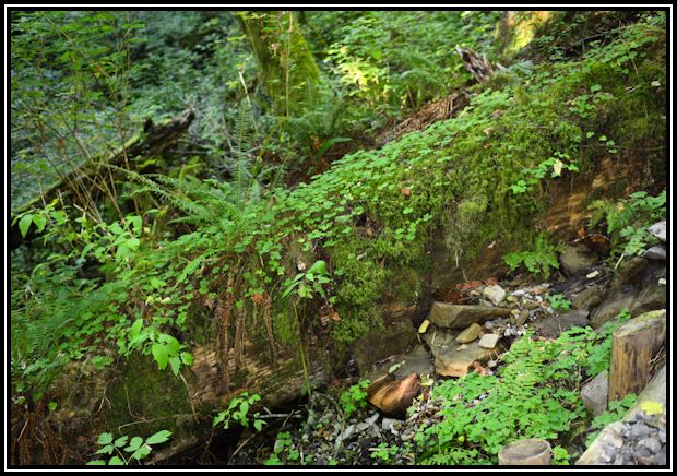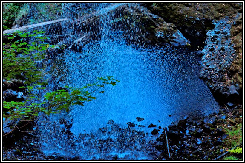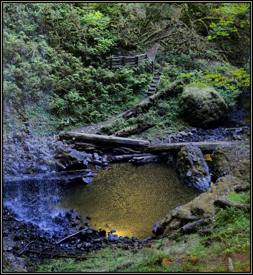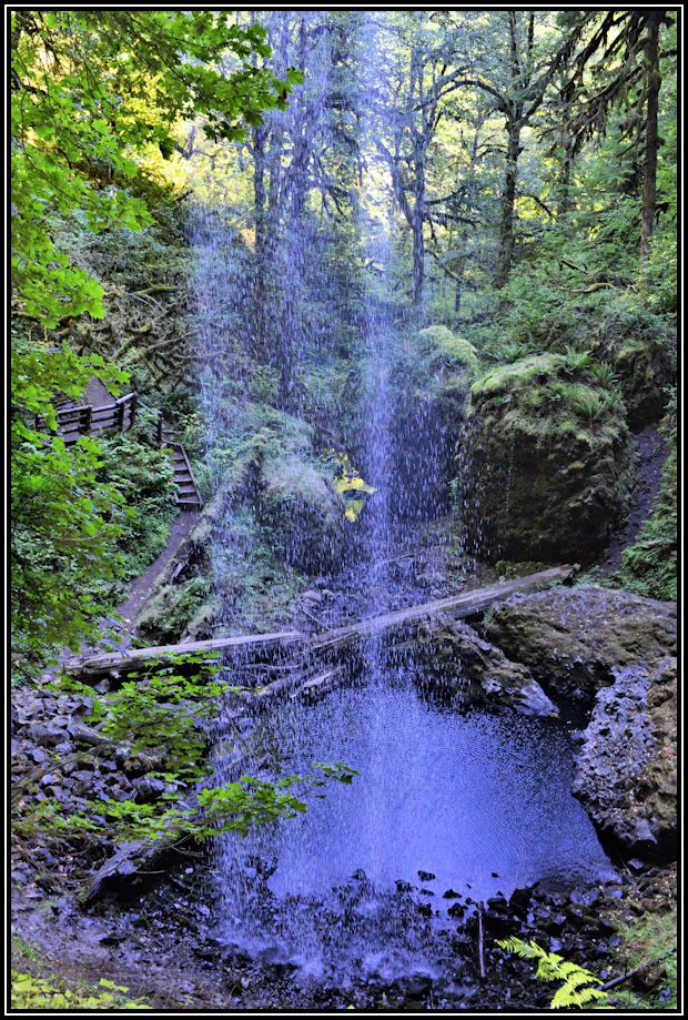 Shellburg Falls Bit of a grind getting up here on a hot day. These views are typical of what you will find in the western Cascades. The trail takes you behind the falls. Erosion removes layers of volcanic ash from between alternating slabs of basalt, creating covered ledges that support walkways behind the falls.
