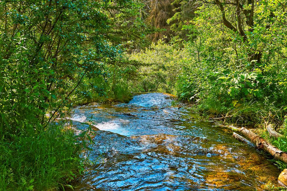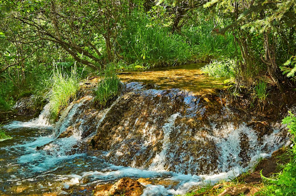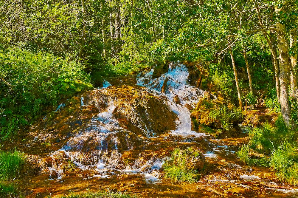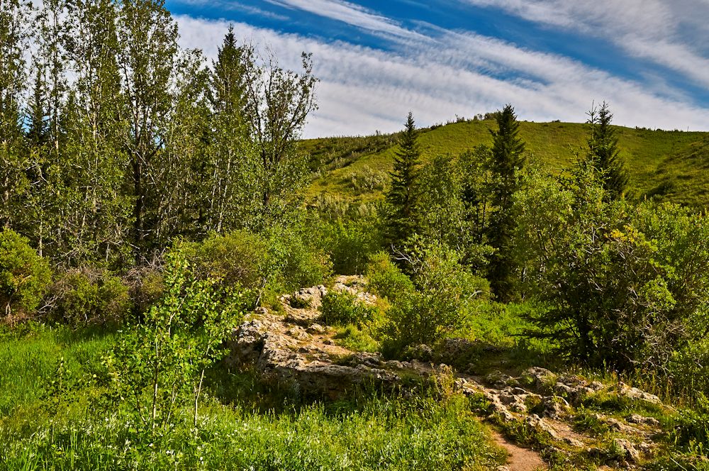 This coulee forms the eastern border of the park and collects the water from the springs which then drains into the Bow river to the south.